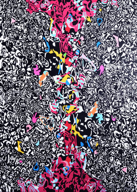 Bernd Terwey verdichtet in diesem Werk zwei Figuren zu einer komplexen, vielschichtigen Einheit. Geometrische Fragmente, grafische Muster und kräftige Farbfelder greifen ineinander und erzeugen eine Struktur, die an kubistische Mehransichtigkeit ebenso erinnert wie an urbane Graffiti. Die übergroßen Augen fungieren als Zentren gesteigerter Wahrnehmung und spiegeln innere Spannung sowie soziale Überforderung.